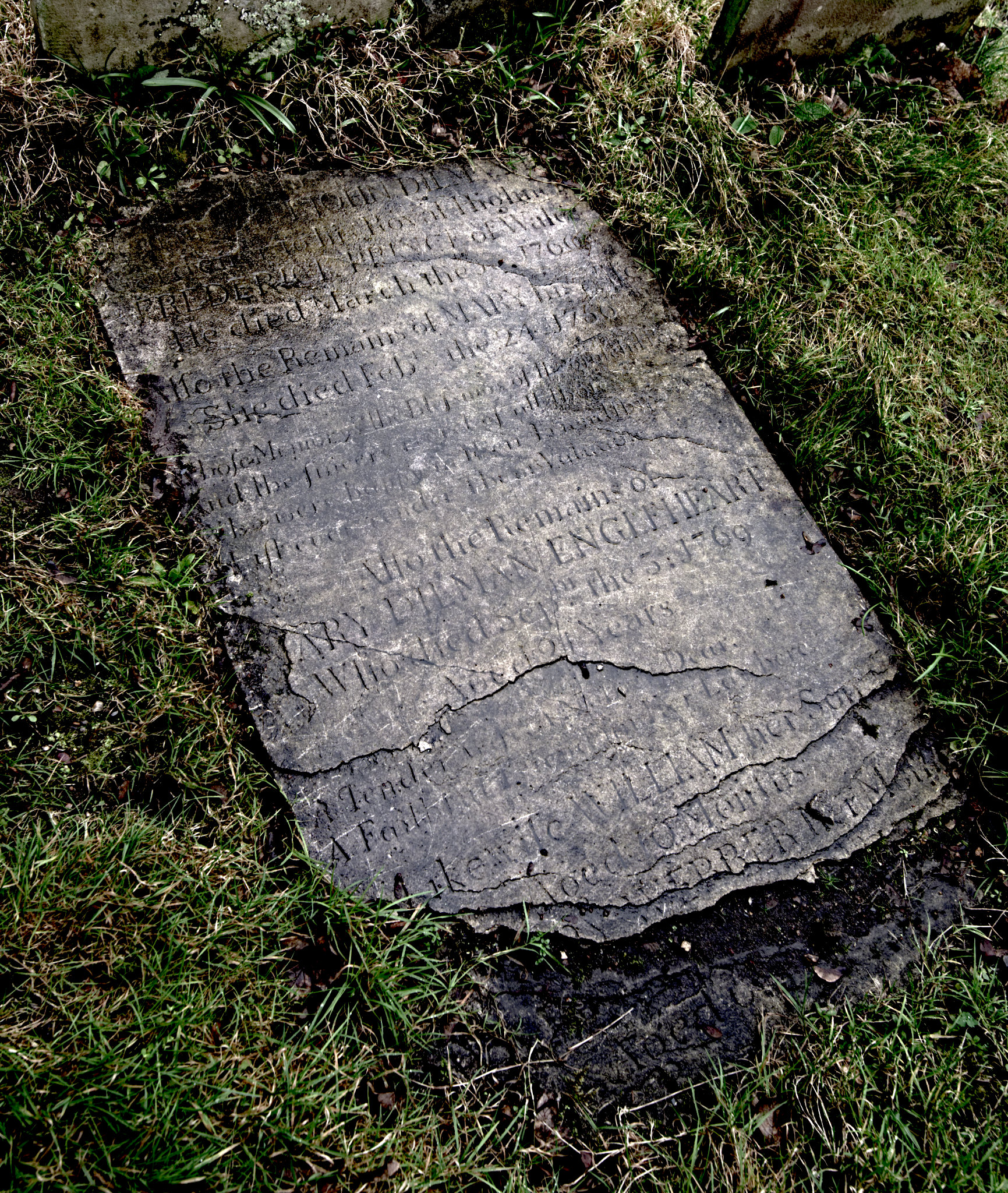 JOHN DILMAN gardiner to his Royal Highness FREDERICK PRINCE of WALES He died March the ? 1760 Also the Remains of MARY his wife She died Feb.r. the 24th 1756 ... ... ... Also the Remains of MARY DILMAN ENGLEHEART Who died Sep.m. the 3rd 1769 Aged 21 Years Likewise WILLIAM her Son Aged 10 Months A Tender ... ... Dear A Faithful .. .. here ..RY WEBBER her Moth...